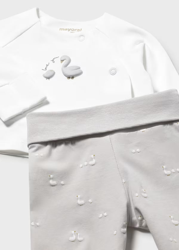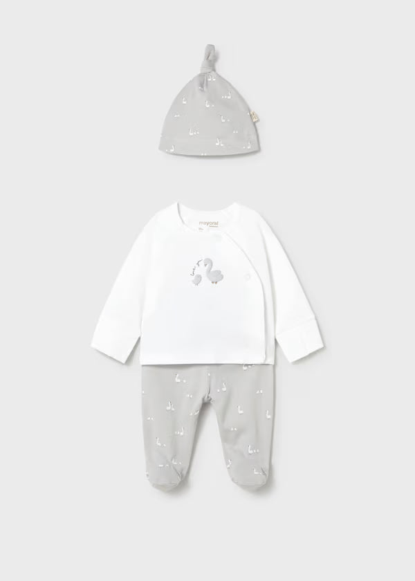 Completo neonato composto da 3 pezzi: maglietta bianca a manica lunga con apertura frontale, pantalone con piedino e cappellino coordinato grigio perla stampato.